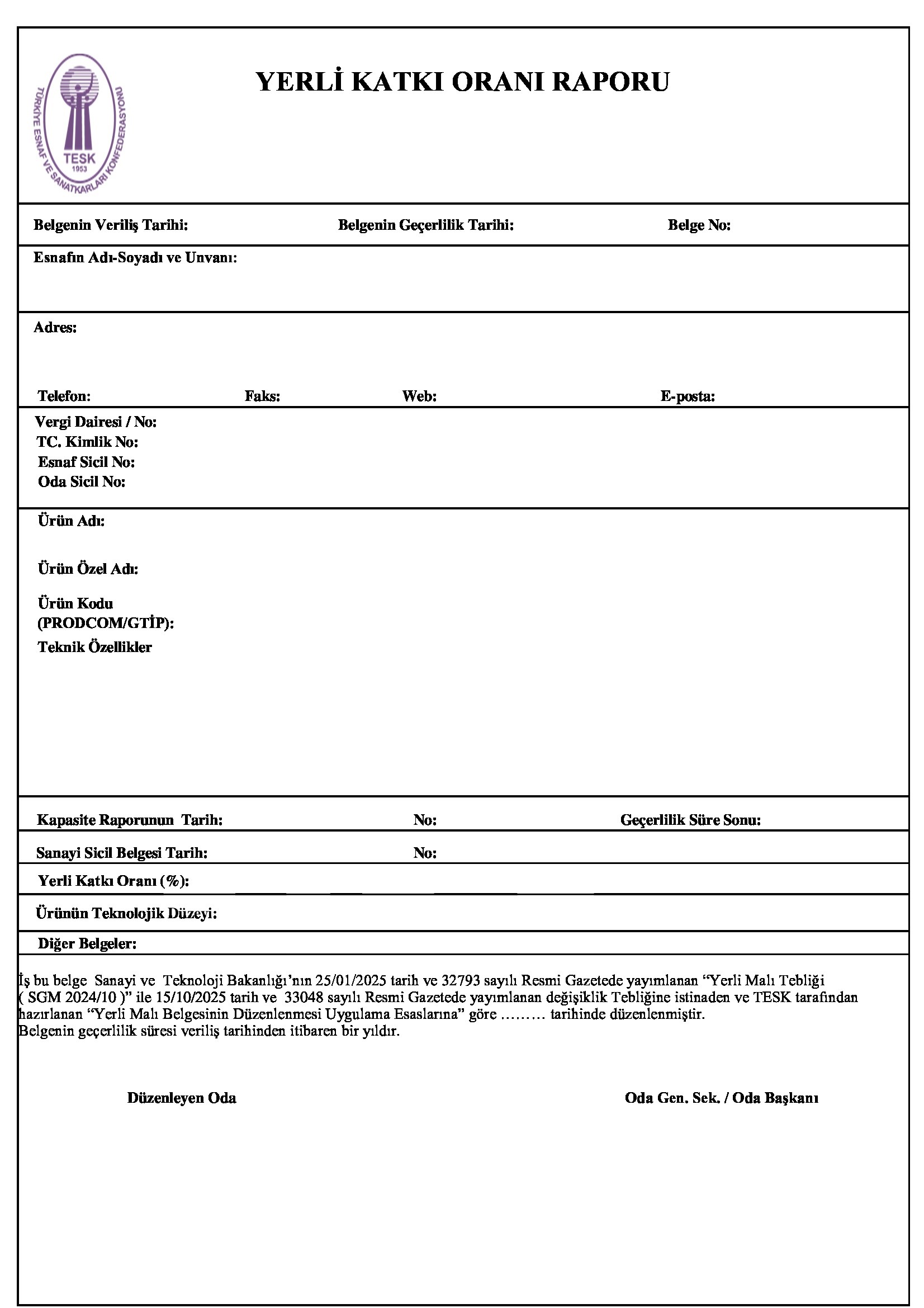 6- YerliKatkı Belgesi Standart Formu (1 Adet- 1 Sayfa)
