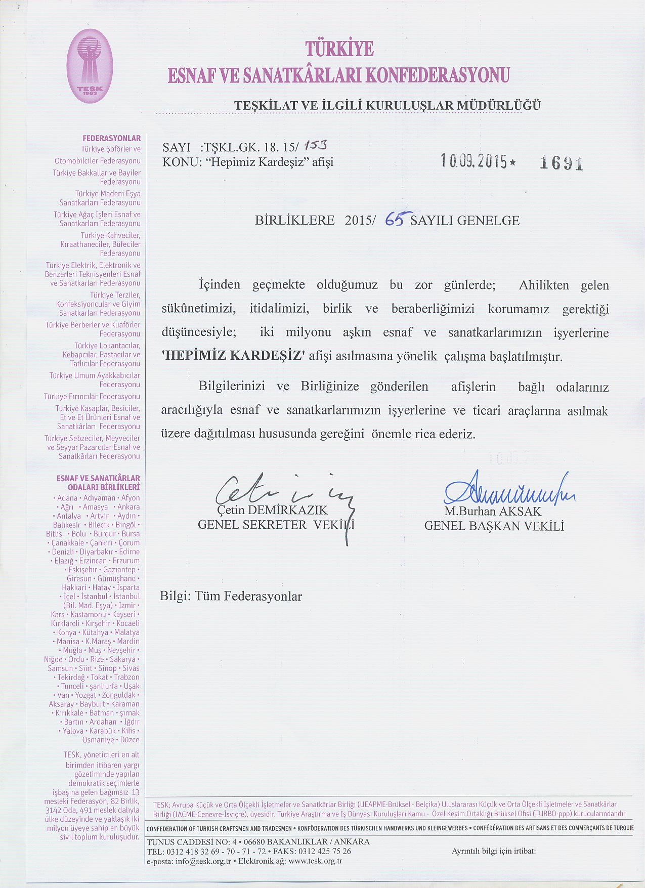 Bilgilerinizi ve Birliğinize gönderilen afişlerin bağlı odalarınız aracılığıyla esnaf ve sanatkarlarımızın işyerlerine ve ticari araçlarına asılmak üzere dağıtılması hususunda gereğini önemle rica ederiz.