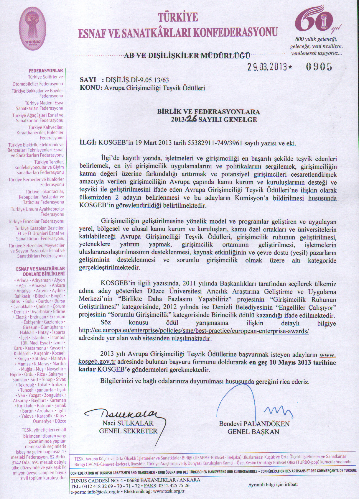 Avrupa Girişimciliği Teşvik Ödülleri 026 Sayılı Genelge 29.03.2013