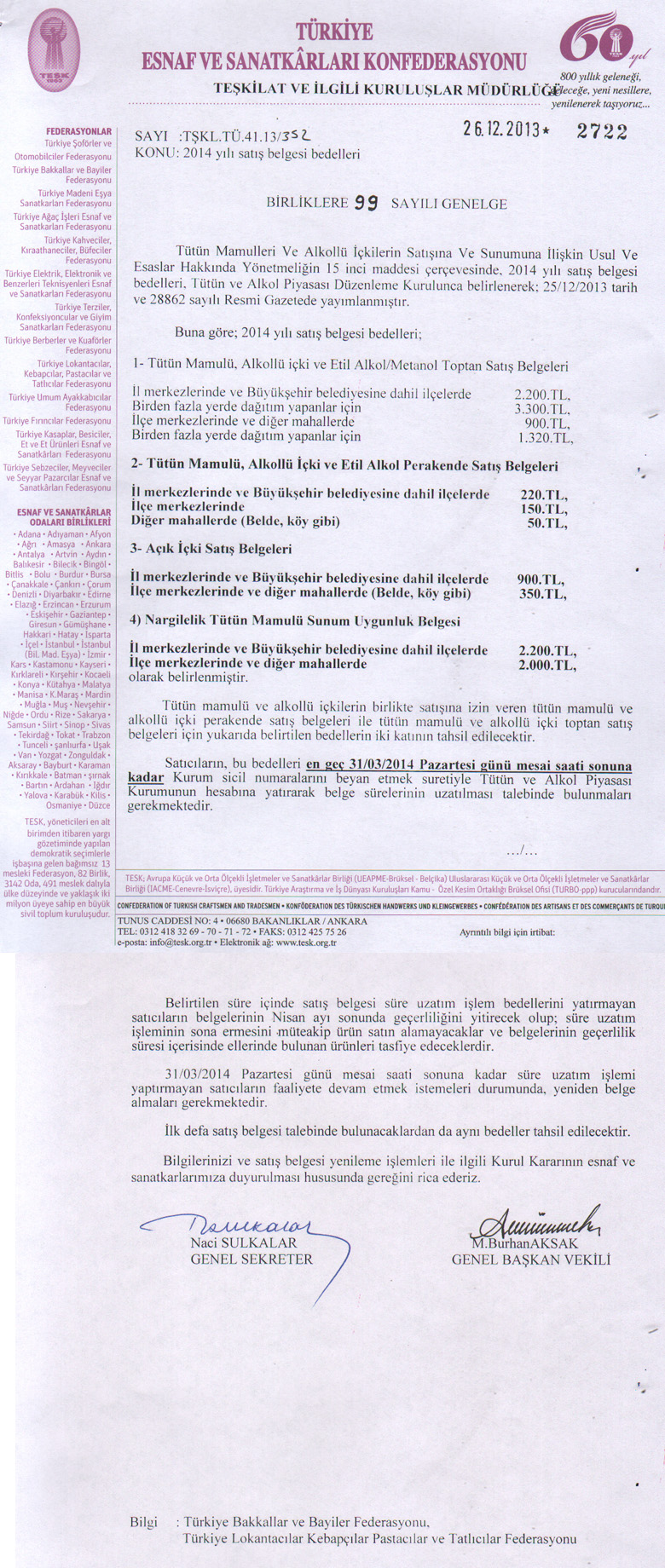 2014 Yılı Satış Belgesi Bedelleri 099 Sayılı Genelge 26.12.2013