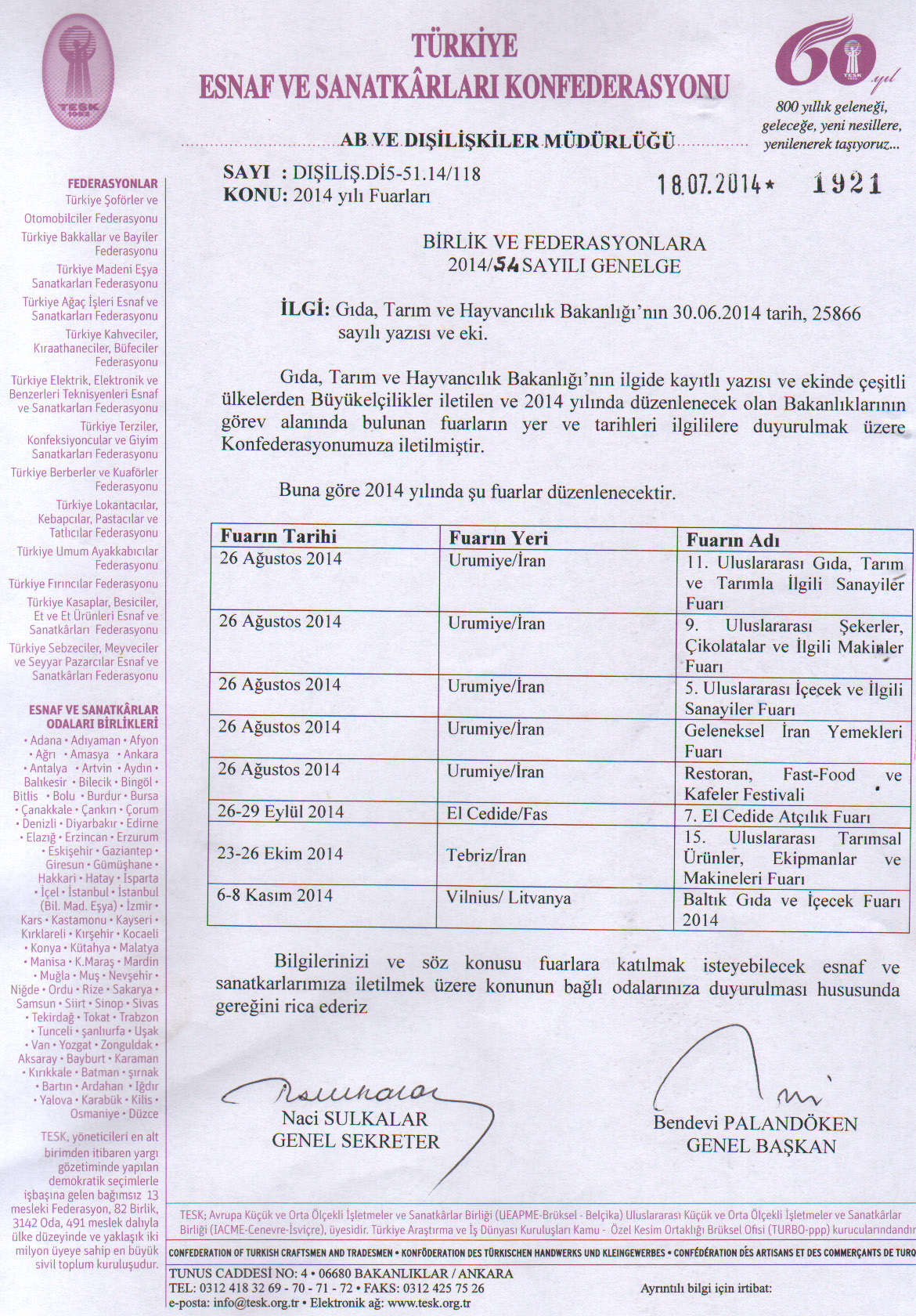 2014 Yılı Fuarları 054 Sayılı Genelge 18.07.2014