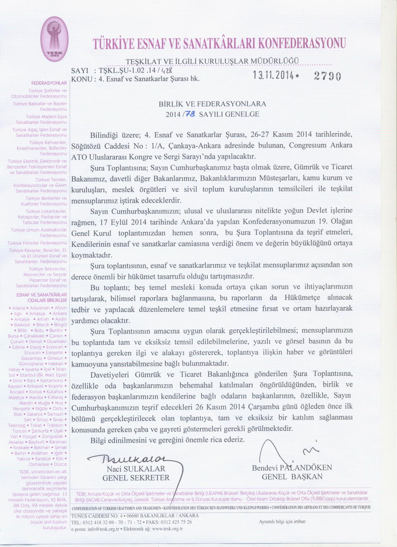 4.Esnaf ve Sanatkarlar Şurası 078 Sayılı Genelge 13.11.2014